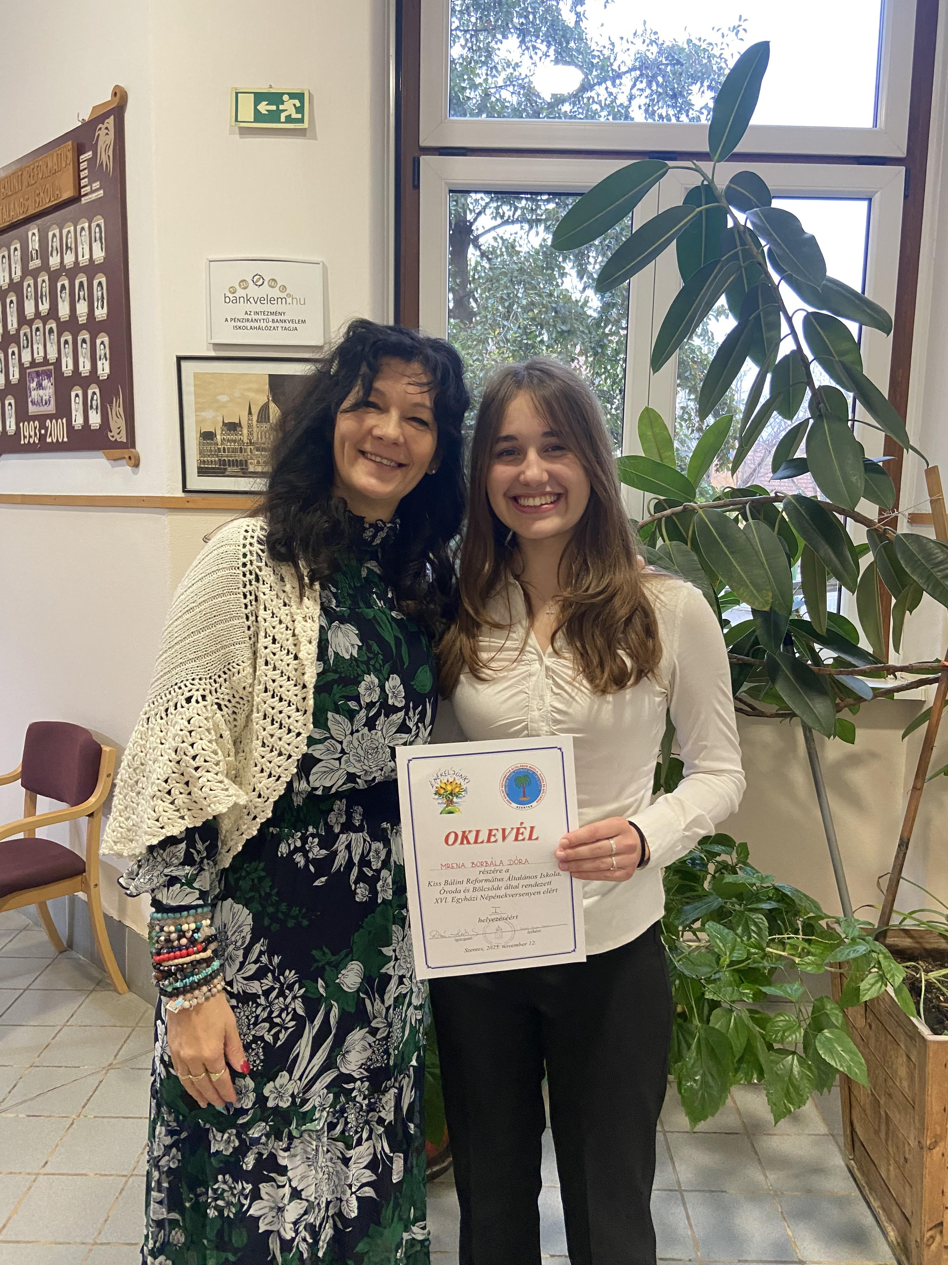 A XVI. Országos Egyházi Népének versenyen, melyet Szentesen rendeztek 2025. november 12-én, Mrena Borbála Dóra 11.C osztályos tanulónk csodálatos énekhangjával 1. helyezést ért el.